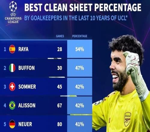 北京时间12月11日,德转列出了欧冠近10年出战至少25场比赛的门将零封率前10,阿森纳的戴维-拉亚以54%的零封率高居第一,布冯47%排名第二,索默和阿利松同以42%的零封率并列第三,奥纳